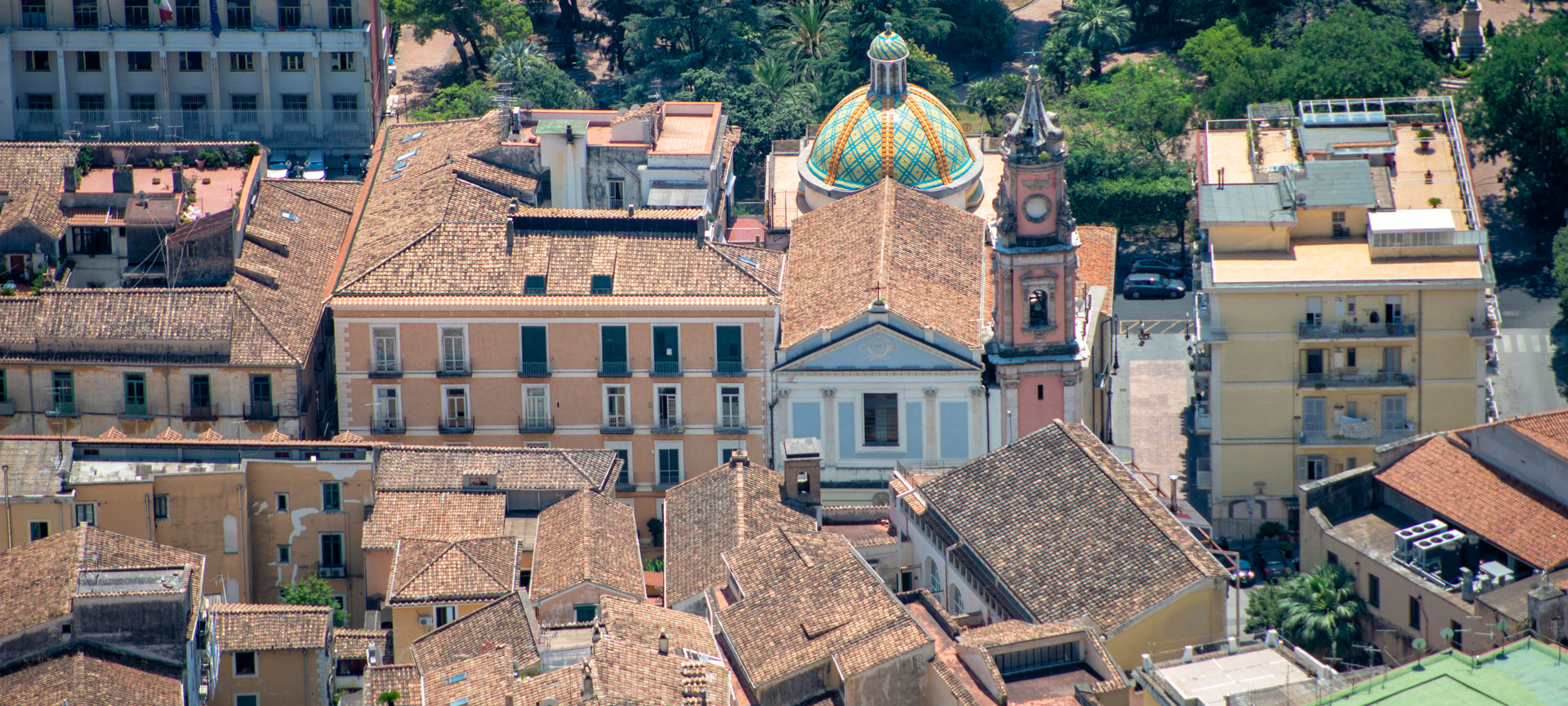 Nella veduta dall’alto di Salerno, si distingue nella distesa di tetti rossi della città medievale con la sua cupola di maiolica gialla e azzurra.