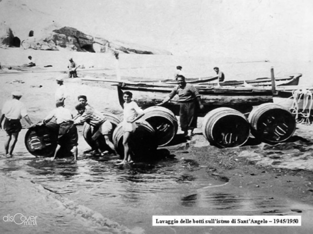 Tra tutte, la produzione più preziosa era il vino. Al momento convenuto, una volta all’anno, i vignaioli scendevano nel borgo con i muli carichi di vino da esportare. Ai piedi dell’isolotto ciascuno scaricava in enormi vasche, in cui era mescolato prima di riempire le botti che venivano poi buttate a mare, da dove venivano issate a bordo dei velieri. Quel vino della comunità partiva dal piccolo approdo santangiolese verso la Toscana. Giorni e giorni di viaggio per raggiungere Piombino e scaricare le botti di generoso vino rosso santangiolese, molto ricercato nella terra del Chianti. Per essere commercializzato, non di rado, proprio come tale…