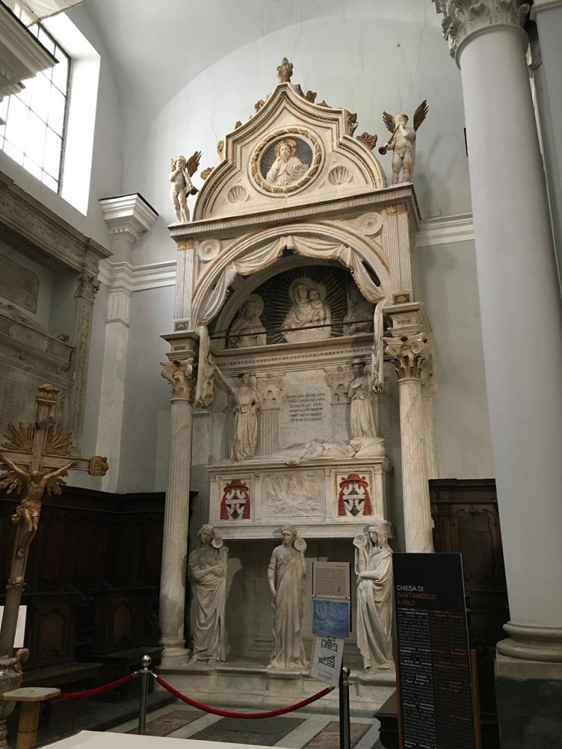 La zona più interessante della chiesa di Sant’Angelo a Nilo è quella absidale. Di particolare importanza è il Monumento sepolcrale del cardinale Rainaldo Brancaccio, gioiello della scultura del primo Rinascimento. Collocata alla destra dell'altare maggiore, l’opera fu realizza a Pisa da Donatello e Michelozzo diBartolomeo tra il 1426 e il 1428, e inviata successivamente a Napoli via mare. All'impresa presero parte anche alcuni aiuti, tra i quali, il maestro toscano Pagno di Lapo Portigiani. Il sepolcro è in marmo e si sviluppa su più livelli. Ciò che colpisce di più lo sguardo dell’osservatore è la cassa sepolcrale che, sorretta da tre figure femminili (le Cariatidi), presenta la figura giacente del defunto, ma soprattutto un bassorilievo raffigurante l'Assunzione della Madonna realizzato da Donatello. Questo capolavoro donatelliano venne realizzato con lo stiacciato, una tecnica scultorea che permette di creare una lieve sporgenza dal fondo dando vita a un effetto illusionistico di profondità.
